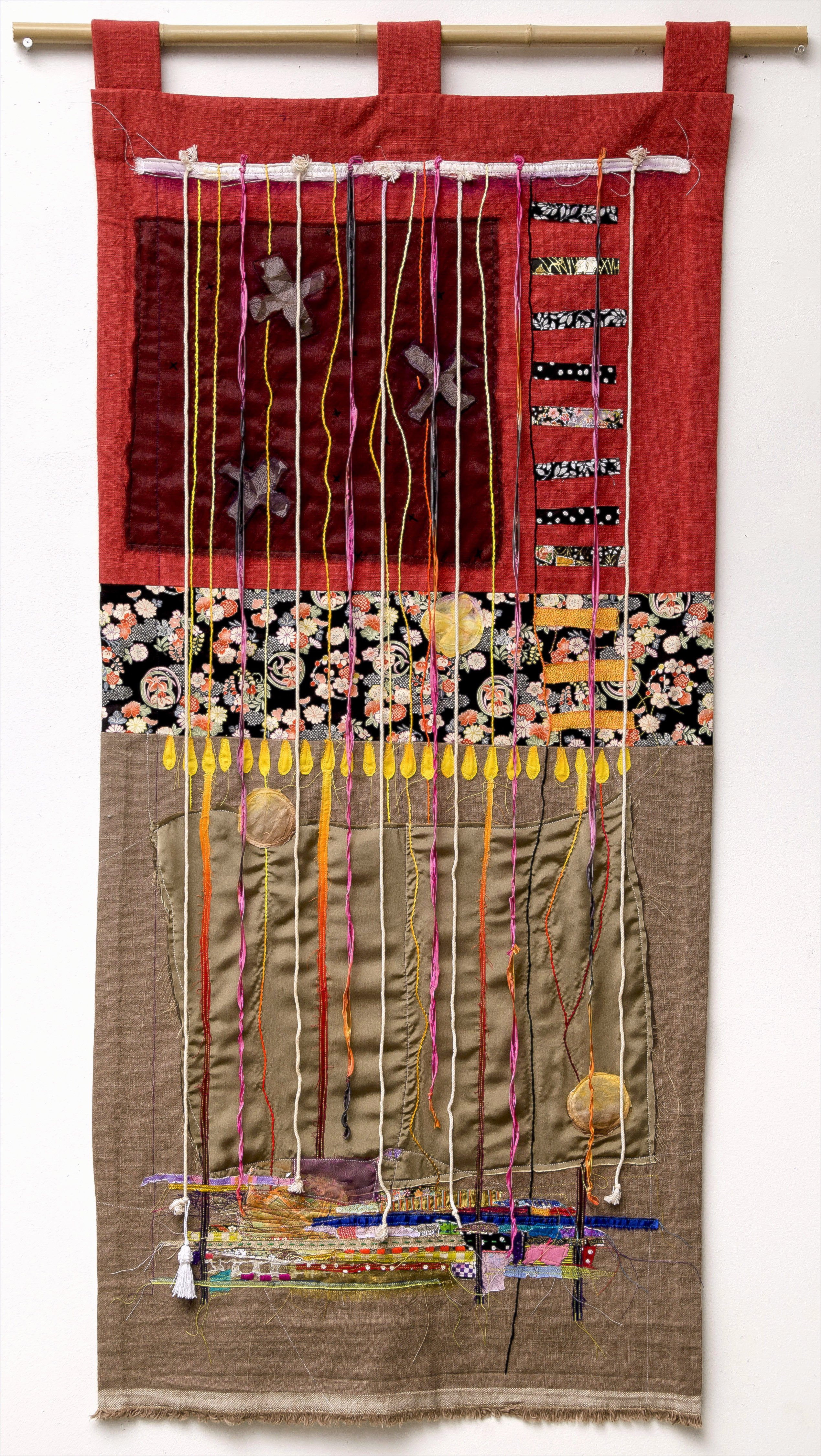 Open Art Code is a group of international artists, coordinated by Vito Abba and Carlotta Marzolla, with the intention of exhibiting around the world. In Geneva, they showed at the Studio Art Unlimited Gallery, in the old town. Kaman had 3 textile works exhibited, “Orbit”, “String Along” and “Winding Trail”. All 3 involved sewing, painting and embroidery.